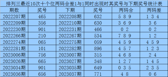 十个位合差分析:上期奖号十个位开出65组合,两码合为1,两码差为1,最近10次十个位两码合1与两码差1同时出现时,其奖号和下期奖号分别为: