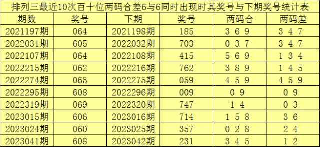 百十位合差分析:上期奖号百十位开出06组合,两码合为6,两码差为6,最近10次百十位两码合6与两码差6同时出现时,其奖号和下期奖号分别为: