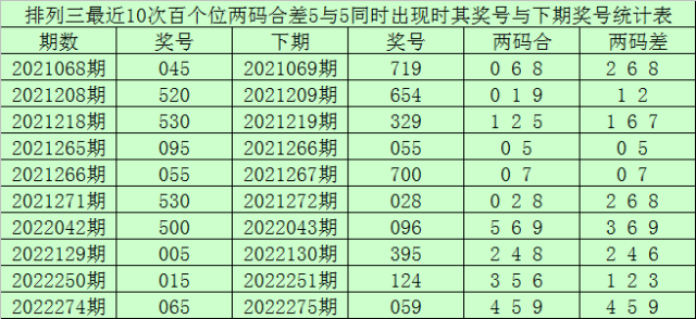 百个位合差分析:上期奖号百个位开出05组合,两码合为5,两码差为5,最近10次百个位两码合5与两码差5同时出现时,其奖号和下期奖号分别为: