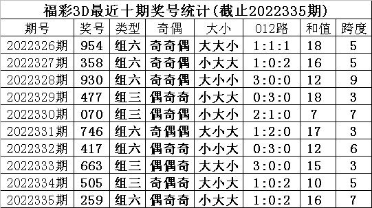 开奖回顾:福彩3D第2022335期奖号为259,奖号形态为:组六、小大大、1:0:2、偶奇奇。