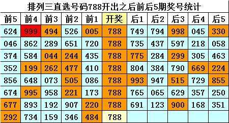 四、排列三直选号码788历史上开出8次,其前后五期奖号分别为: