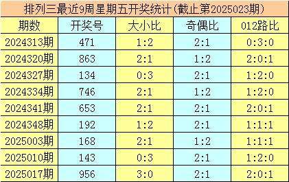 三、体彩排列三前9周星期五奖号分别开出:471-863-134-746-653-192-168-143-956,其中号码012路比为11:11:5,奇偶比为15:12,大小比为13:14;