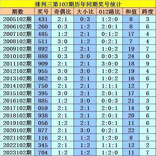 开奖回顾:排列三第2024101期开出奖号030,奖号012路比为3:0:0,大小比为0:3,奇偶比为1:2,最近三年第102期同期开出奖号为:第2021102期:116、第2022102期:345、第2023102期:704。