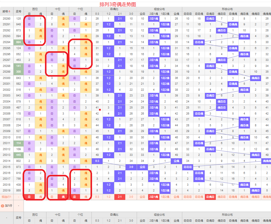 上一期的奇偶比为1:2,俩偶的号码组合,从近五期的奇偶数出现情况看,奇数出9次,偶数出现6次,奇数号码出现较多,本期要侧重两奇的号码组合,侧重奇偶奇或偶偶奇的号码组合,根据奇偶组合形态可做五码定位13579/02468/13579或02468/02468/13579