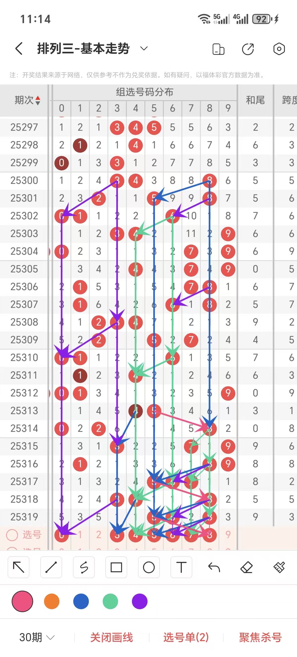 通常情况下在五期之内重复一个跨度的概率较高,近五期没有重复的跨度,近五期跨度为6/8/2/5/3,近期2路的跨度较热,本期要侧重3/5/6跨为主的号码组合。选择好跨度就可以从跨度方面选择相应的双胆码组合,双胆码的选取要根据近期和历史的走势进一步的分析选取。