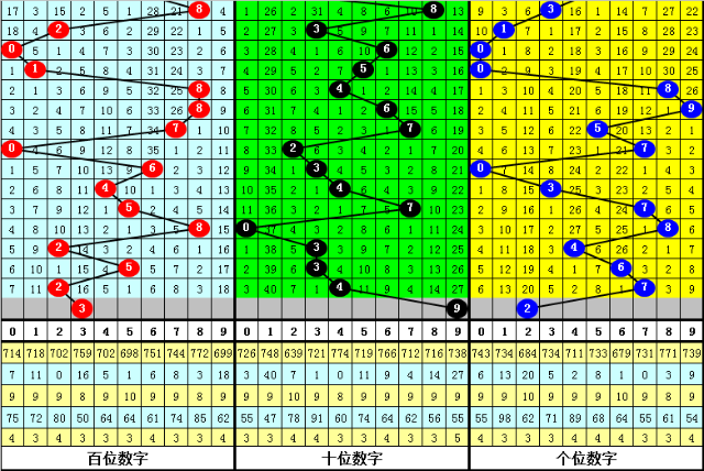 组选分析:在0-9的组选分布图中,最近10期0-2区段开出6个号码,3-6区段开出14个号码,7-9区段开出10个号码,上期各区段分别开出1个奖号,本期看好各区间分别开出1个奖号,