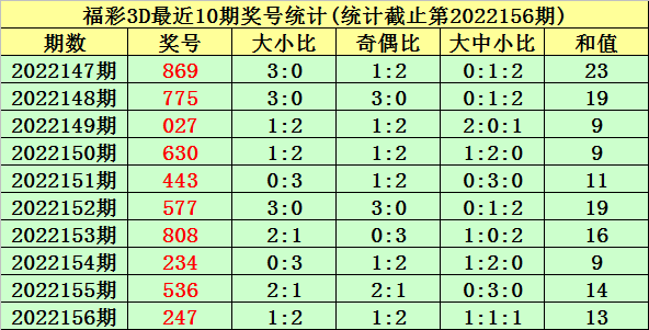 开奖回顾:福彩3D第2022156期奖号为:247。奖号类型为组六,和值为13,奇偶比为1:2,跨度为5,012路比为0:2:1,大小比为1:2。