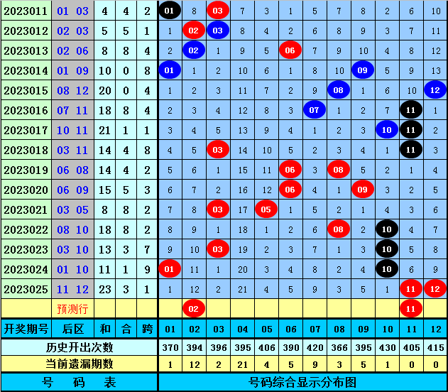 后区分析:上期后区开出2路+0路号、一质一合组合,最近10期后区奖号012路比为7:6:7,质合比为10:10,本期看好后区在02、03、04、11、12之内落号,精选后区奖号02、11。