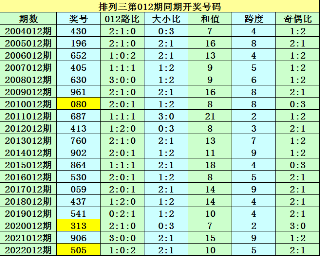 本期为排列三第2023012期开奖,开奖日期为:2023年1月12日,历史上排列三第012期已开出了19次奖号,历年同期开出号码分别为:430-196-652-405-630-961-080-687-413-760-902-864-530-059-437-541-313-906-505。