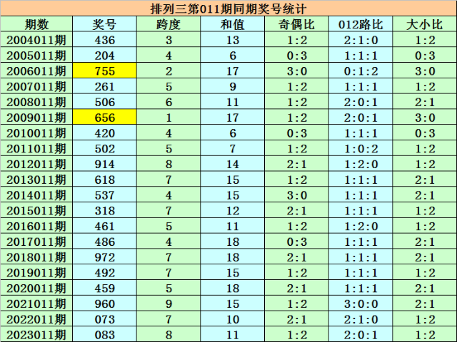 号码跨度:在第012期同期奖号中,跨度开出频次分别为:跨度4开出5期,跨度5、8、9开出3期,跨度2开出2期,跨度3、6、7开出1期,跨度0、1没有出现。去年同期开出5,今年同期注意跨度重复开出,继续关注跨度5。