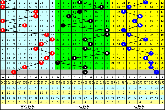 大中小分析:在组选0-9号码分布图中,前10期小号(0-2区段)出现5枚奖号,中号(3-6区段)出现13枚奖号,大号(7-9区段)出现12枚奖号,上期0小号区域断区,本期预计大中小区域各出1枚奖号。