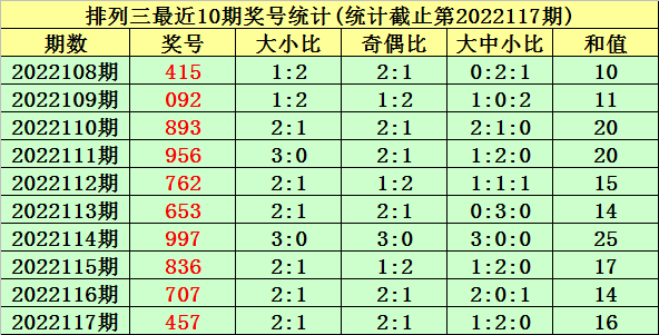 上期回顾:排列三第2022117期奖号为:457。奖号类型:组六,和值:16,奇偶比:2:1,跨度:3,大小比:2:1。