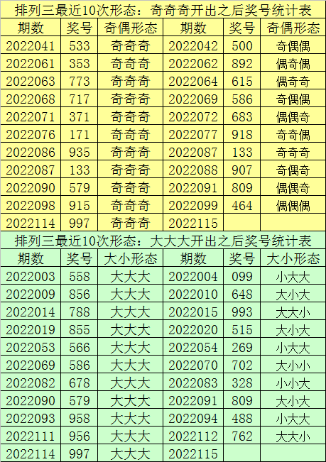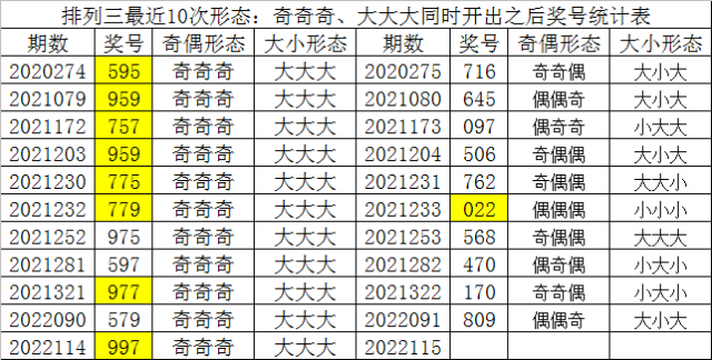 排列三最近10次同时开出奇偶形态:奇奇奇和大小形态:大大大时其奖号分别为:595-959-757-959-775-779-975-597-977-579-997,下期分别开出号码为:716-645-097-506-762-022-568-470-170-809,详细统计见下表: