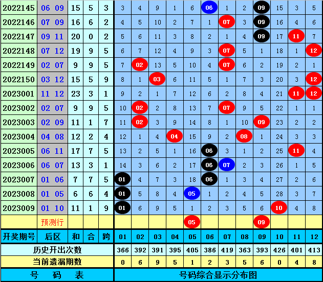 后区分析:上期后区两码开出01+10,为一大一小组合,近50期后区全大组合出现10次,全小组合出现12次,一大一小组合出现28次,,近10期后区全大组合出现1次,全小组合出现2次,一大一小组合出现7次,本期预计后区一大一小组合再出,参考号码05、09。