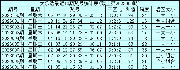 大乐透第2023009期奖号为,前区:01、05、11、15、33;后区:01、10。其中前区奖号三区比为3:1:1,和值为65,跨度为32,后区开出一大一小组合。