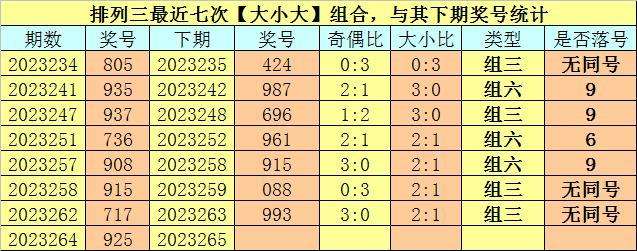 奖号类型分析:排列三最近七次【大小大】组合与【奇偶奇】组合出现之后,其下期组三号码开出6次,组六号码开出8次,其中组六号码出现次数相对较少,本期适当关注组六号码出现。另外,其下期有6期没有出现重号,本期不看好开出重号。