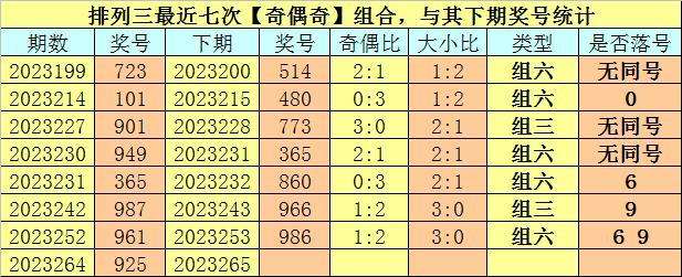 奇偶分析:排列三上期奖号为925,其奇偶类型为【奇偶奇】,最近七次出现奇偶类型奇偶奇的号码分别为:723、101、901、949、365、987、961,其下期奖号分别为:723、101、901、949、365、987、961。其中号码奇偶比为9:12,奇偶奖号开出比例基本平衡,本期看好偶数号码转热,注意奇偶比1:2出现。