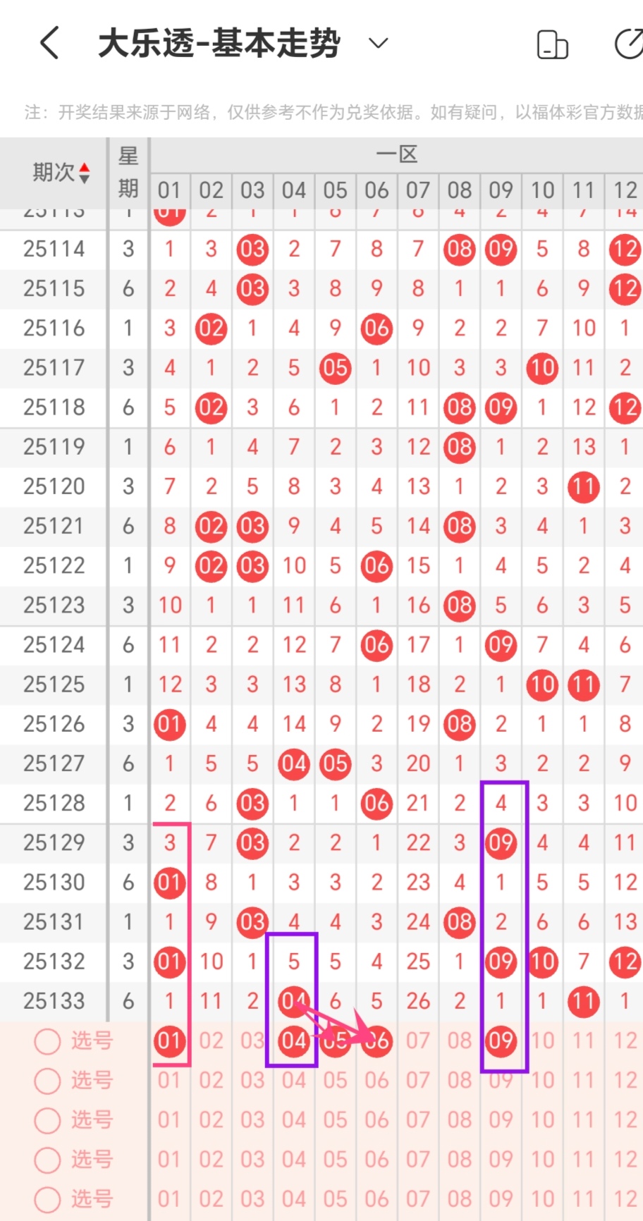 通过对同期次重号出现的数量规律进行统计分析,本期考虑出号0-1个,即01-04-07-13-33出号0-1个