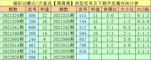 开奖回顾:福彩3D第2022028期开奖号码为086,奖号直选类型为:偶偶偶、小大大和020路。