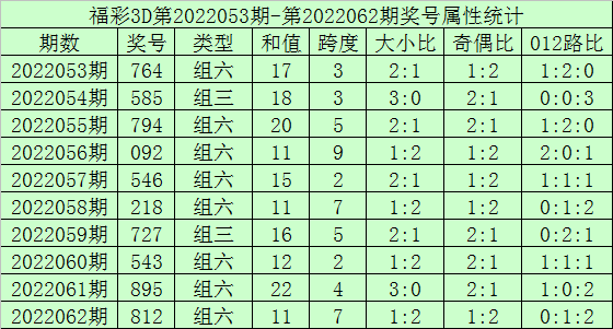 开奖回顾:第2022062期3D奖号为812。形态:组六,奇偶比1:2,大小比1:2,012路比为0:1:2。