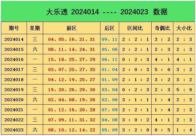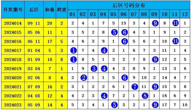上期回顾:大乐透第2024023期奖号为:前区08、10、12、14、22,后区05、09,前区奖号三区比为3:2:0,奇偶比为0:5,大小比为1:4,后区开出小大组合05、09