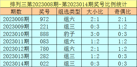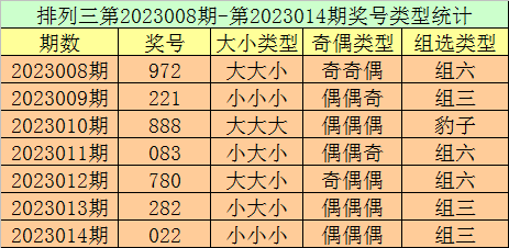排列三第2023014期回顾:奖号022,奇偶比0:3,大小比0:3,和值4,类型:组三。