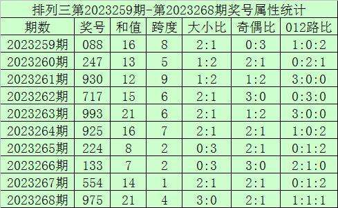 上期回顾:排列三第2023268期开奖号:975,奖号和值:21,奇偶比2:1,大小比3:0。