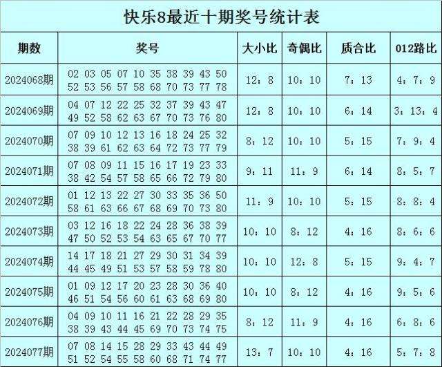 福彩快乐8第2024077期开奖回顾:07 08 14 15 28 29 33 43 44 49 51 52 54 55 58 60 68 71 74 77,其中奖号大小比开出13:7,奇偶比开出10:10,质合比开出4:16,012路比开出5:7:8。