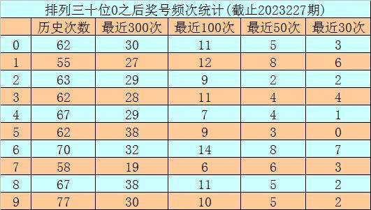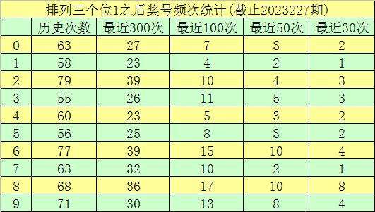 第一位杀号:上期第一位奖号为9,第一位奖号9历史上出现655次,前100次该位开出奖号9之后,下期号码0-9出现次数从高到底分别为:号码6→16次,1、7、9→13次,5→12次,4→9次,8→7次,2、3→6次,0→5次。