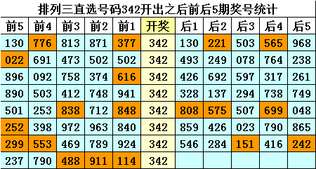 四、排列三直选号码342历史上开出8次,其前后五期奖号分别为: