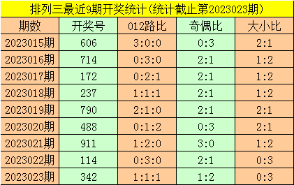 一、排列三第2023023期开出号码342,其奇偶比为1:2,大小比为0:3,号码012路比为1:1:1。该号码直选历史上出现了8次。