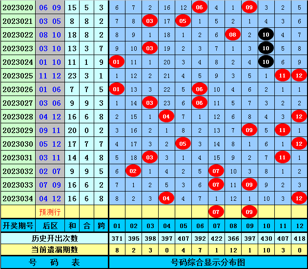 后区分析:上期后区开出奖号04和12,在最近50期开奖中,后区奖号012路落号比为38:33:29,前10期后区012路落号比为10:5:5,本期后区关注号码01、04、07、09、10,两码参考07、09。