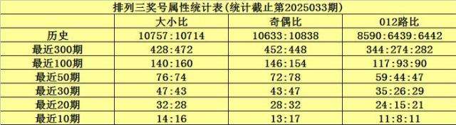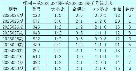 上期回顾:排列三第2025033期奖号为934,奖号012路比为2:1:0,奇偶比为2:1,大小比为1:2,和值为16,跨度为6。