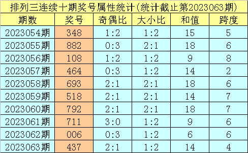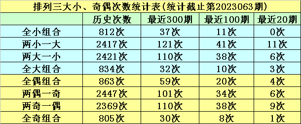 上期回顾:排列三第2023063期奖号:437。类型:组六,奇偶形态:偶奇奇,大小形态:小小大,和值:14,跨度:4。