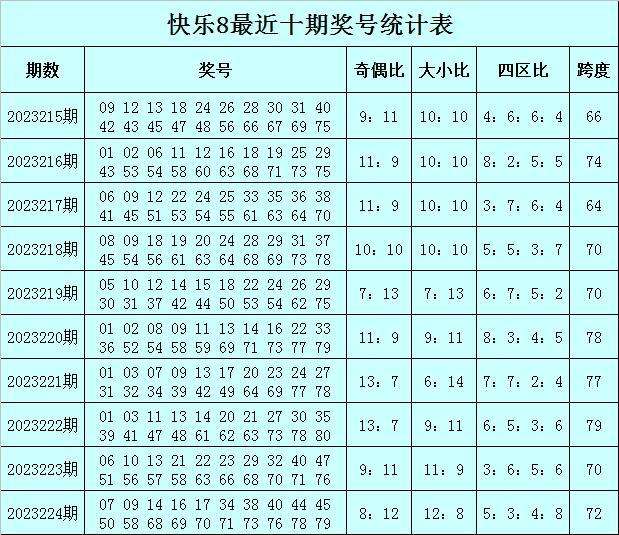 福彩快乐8第2023224期开奖回顾:07 09 14 16 17 34 38 40 44 45 50 58 68 69 70 71 73 76 78 79,其中奖号奇偶比开出8:12,大小比开出12:8,四区比开出5:3:4:8,跨度开出72。