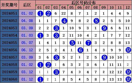 上期后区开出奖号01 12奇偶形态,近7期奇偶形态出现3次,奇奇形态出现3次,偶偶形态出现1次,偶号较活跃,本期推荐后区开出奖号是偶奇形态。