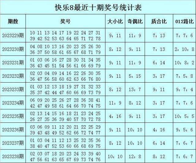 福彩快乐8第2023238期开奖回顾:02 03 07 18 20 23 24 33 39 40 47 56 61 63 65 67 69 73 74 76,其中奖号大小比开出10:10,奇偶比开出12:8,质合比开出8:12,012路比开出7:6:7。