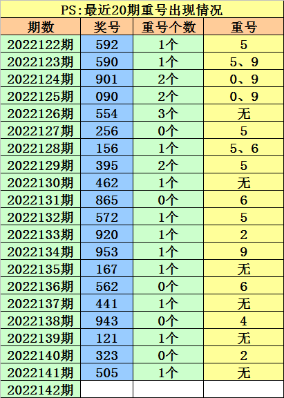 最近100期开奖中,含有重号的奖号有66期,最近20期含有重号的奖号有14期,最近10期含有重号的奖号有6期。本期排除重号。