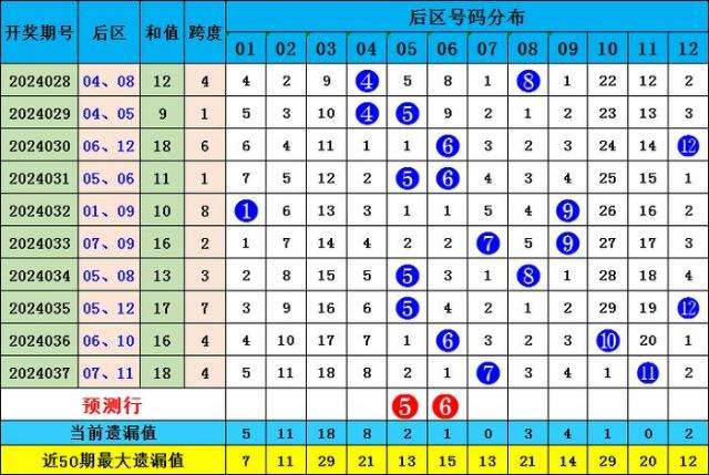 上期后区开出1、2路号码组合:07 11,最近10期后区奖号012路比为8:6:6,本期后区奖号关注2路和0路,后区参考:05 06。