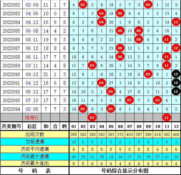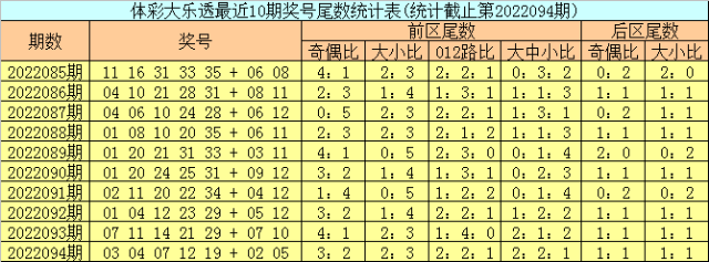上期回顾:体彩大乐透第2022094期开出号码:03 04 07 12 19 + 02 05,其中前区奖号尾数奇偶比为3:2,大小比为2:3,012路比为2:2:1,大中小比为2:2:1,后区奖号尾数奇偶比为1:1,大小比为1:1。