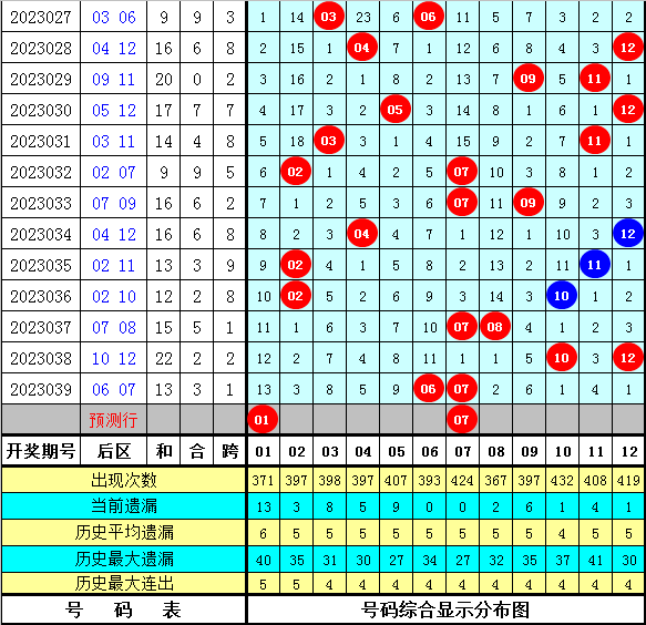7、在第040期历史同期开奖中,后区奖号跨度分别开出:3-3-9-9-5-4-7-6-3-5-2-7-2-6-4-4,跨度范围在2-9之间,本期后区跨度参考6。