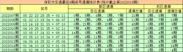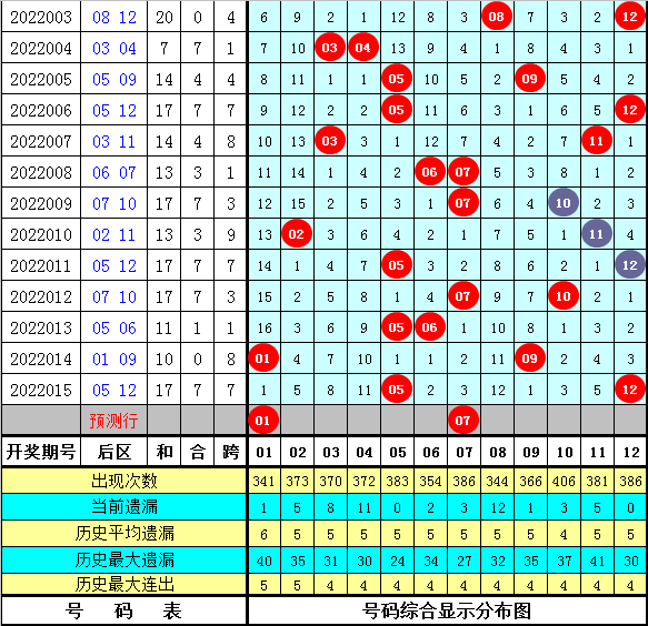 上期回顾:体彩大乐透第2022015期开出奖号为:01 02 08 12 30 + 05 12,其中前区各位奖号分别遗漏:0期、6期、13期、16期和10期,遗漏总值为45期,后区号码分别遗漏1期和3期,遗漏总值为4期。