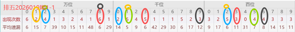 下图所圈出的为近30期各位置所出现的热码出现次数及平均遗漏值,用以参考和一些冷码组合选号。