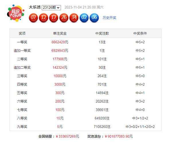 大乐透第2023126期奖号开出:前区07、12、17、26、34,后区02、06。前区号码五区比为1:1:1:1:1,质合比为2:3,012路比为1:2:2,后区开出2路+0路号、一质一合组合。