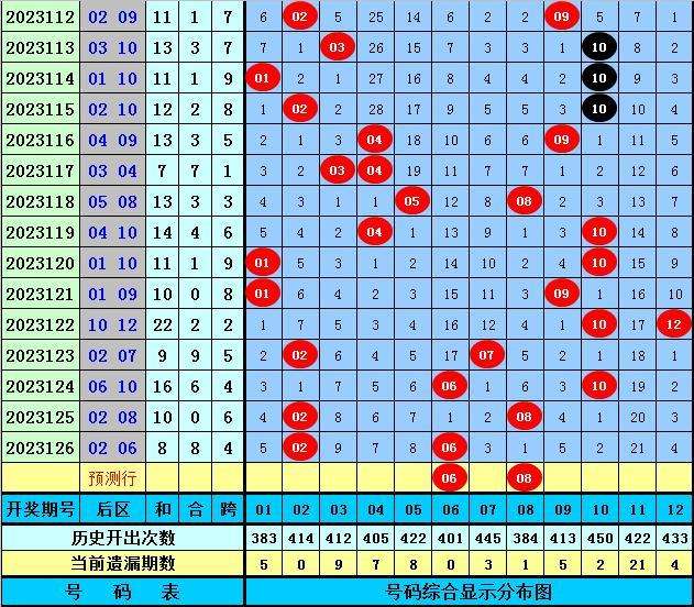 前区质合分析:上期前区奖号质合比为2:3,质合比重复开出,最近30期前区质合比为54:96,最近10期质合比为18:32。根据近期走势,本期看好合数号码增加,前区关注质合比1:4。