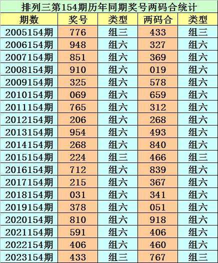 排列三从2004年开奖至今已开出6925期奖号了,其中第154期历史同期奖号出现19次,历年第154期分别开出号码:776、948、851、910、325、069、765、206、954、268、224、712、215、031、378、810、591、406、433。