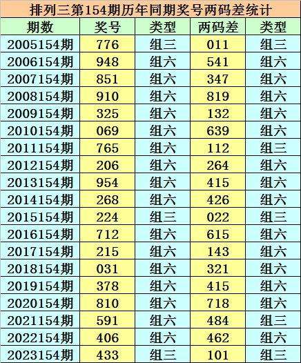 在排列三第154期历史同期开奖中,各号码两码差分别为:011、145、347、189、123、369、112、246、145、246、022、156、134、123、145、178、448、246、011;