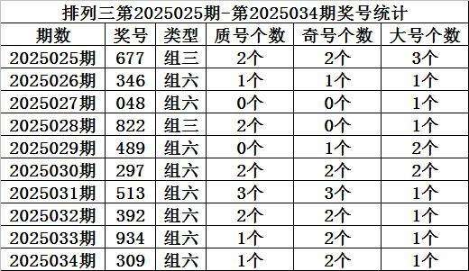 上期回顾:排列三第2025034期开奖:309,质合比为1:2,奇偶比为1:2,大小比为2:1。