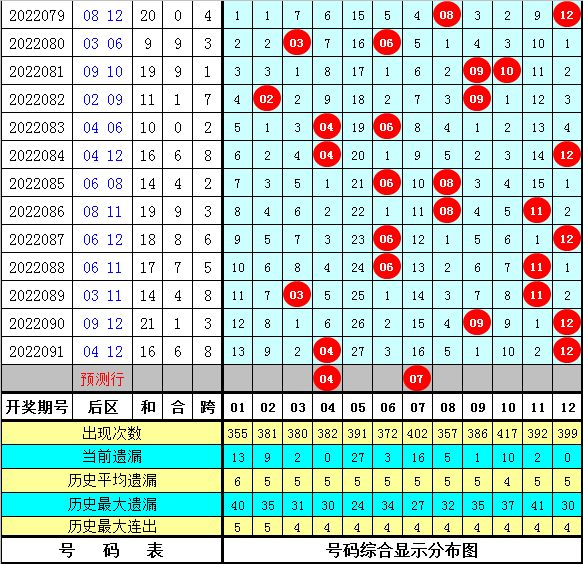 后区第二位:上期开出号码12,遗漏值是0,为重号,最近10期该位号码遗漏值分别为:0期、2期、4期、5期、15期、2期、1期、0期、2期、0期,其中号码冷温热个数比为1:1:8,热码开出8个,出现比例较高。