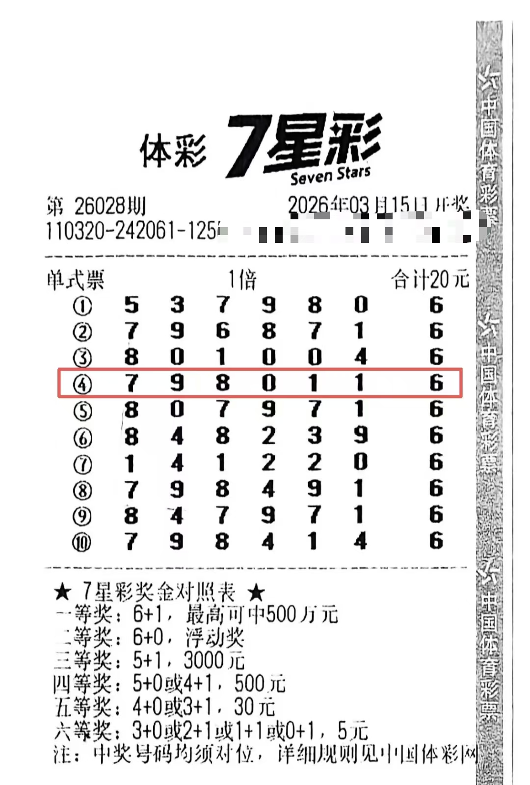 数据显示,7星彩作为体彩经典数字型游戏,单注奖金最高可达500万元。更值得一提的是,每购买1注2元的7星彩彩票,就有0.74元纳入体彩公益金。